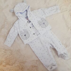 White socks with blue puppy motif. 65% cotton 35% nylon.